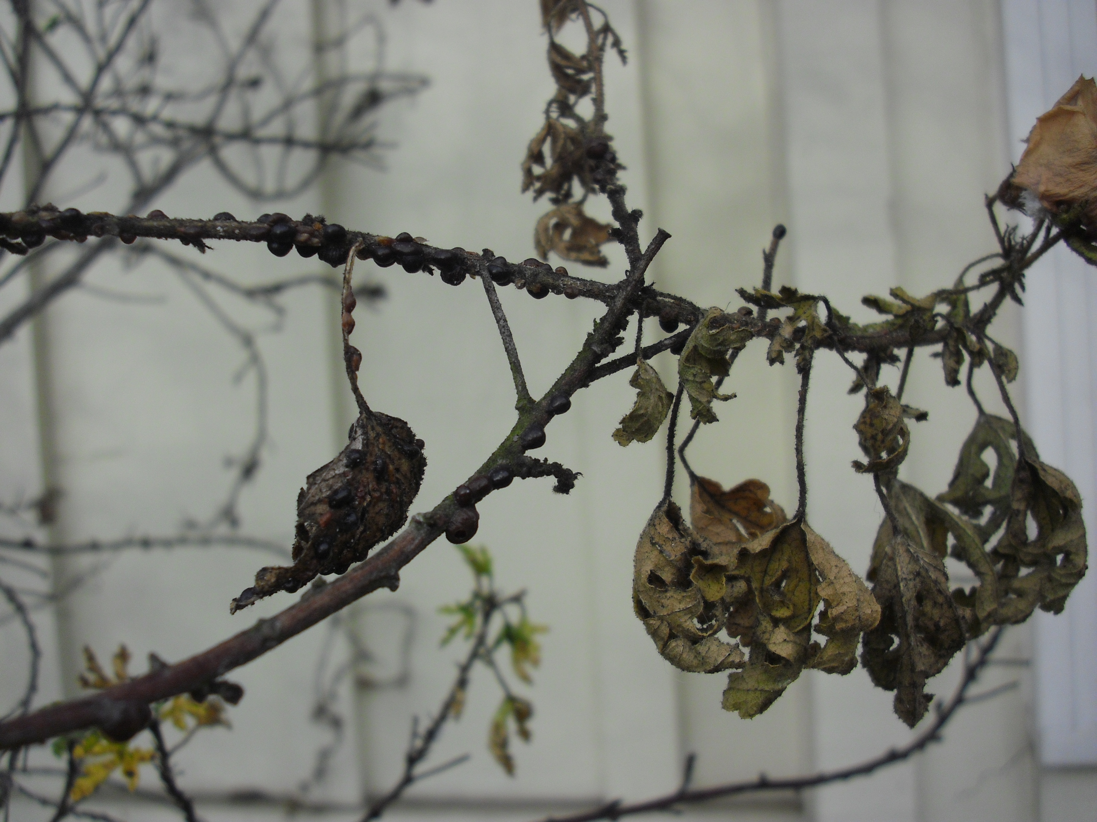 Now, the gophers are gone, the roses are blooming again, a few Dahlias have sprouted. Now is the season of dead Alyogenes (blue hibiscus) and my time of painting rubbing alchohol on the branches of my one tree to kill the white scale. Here is a picture–the scale looks prehistoric. You can take a toothbrush and dip it in alcohol to rub off the bugs, but it takes time and patience.