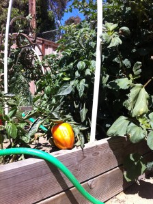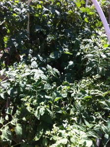 Three tomato plants growing together–Roma, cherry and a beefsteak.