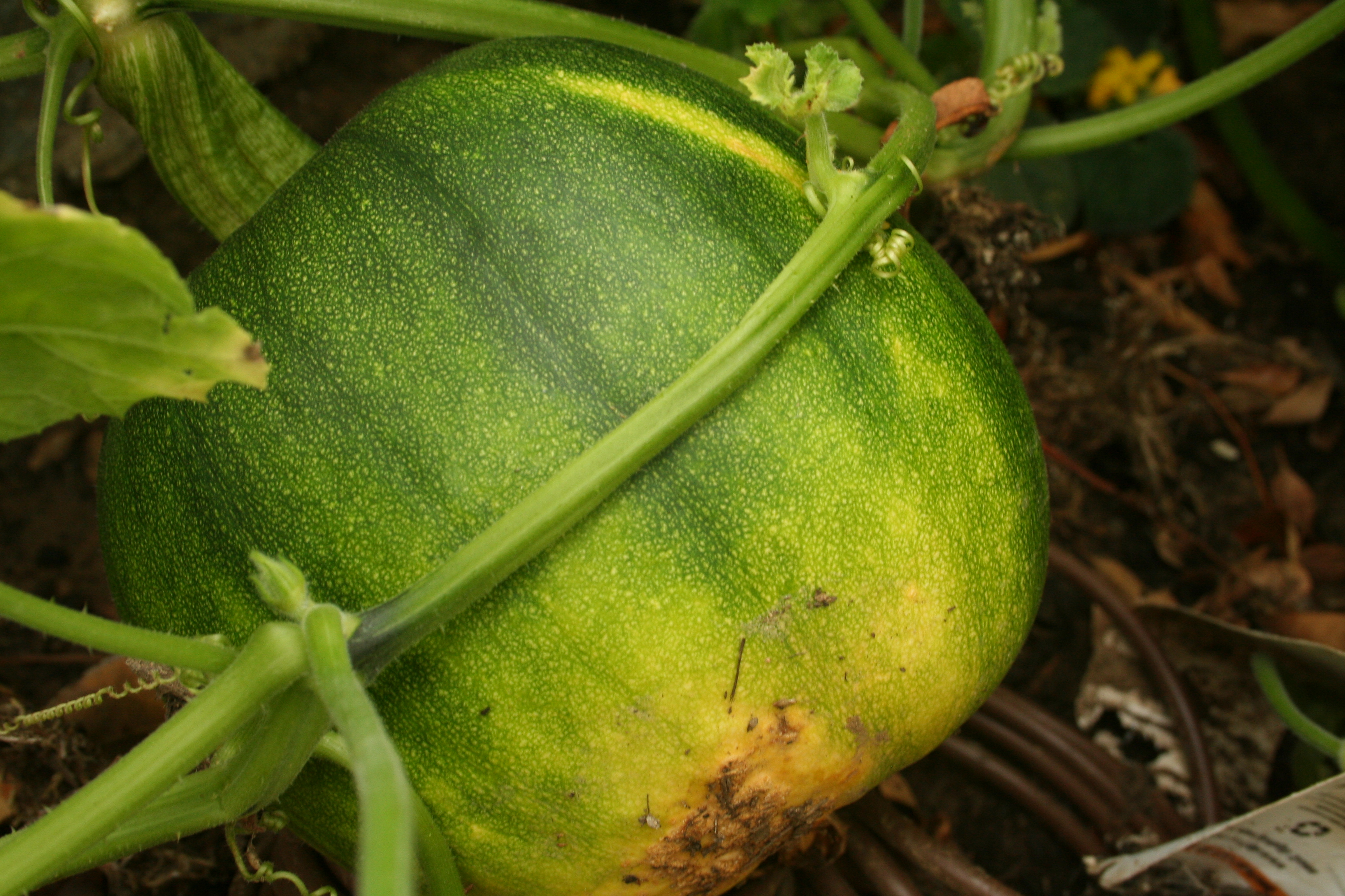 I posted this picture of one of my seven pumpkins — they are actually growing. I am happy to say. I pollinated them (I guess correctly for once!) and went away for a week. When I came back, I actually had pumpkins that were growing large and fat! Here’s a picture. Now I have to wait — the hardest part of growing vegetables!