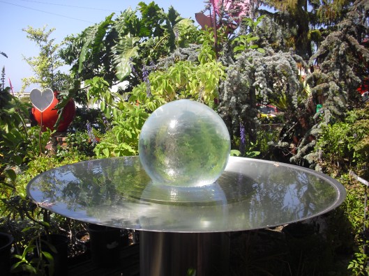 In the front garden, a giant white glass orb floats on the water’s mirror surface and seemed to glow in the bright morning sunlight.
