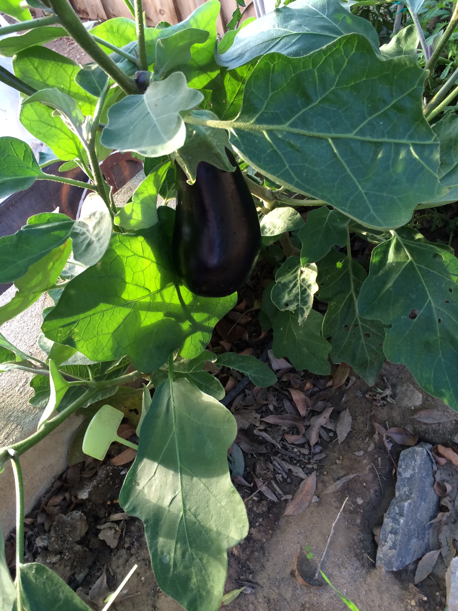 It was so hot this summer that everything in our regular vegetable garden died. This eggplant grew in my daughter’s fairy garden and was shaded by a peach tree.
